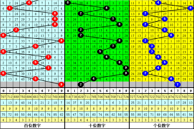 百位上期出现:热号5,该位连续十期以热号出现较多,以冷号出现较少,本期该位温号有5个:1、2、4、8、9,看好温号转热,关注号码9。