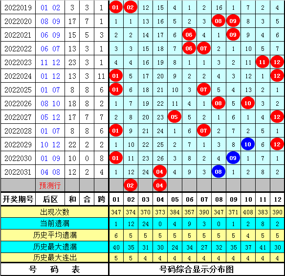 后区上期开出奖号:04+08,前6次后区奖号04+08出现之后,其下期分别开出号码:11+12、04+09、01+12、10+12、01+11、10+11,本期后区注意五码02 03 04 07,单挑两码02 04。