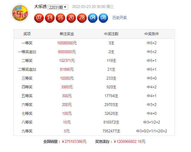 上期开奖:大乐透第2022031期开奖号码为:07 14 16 20 28 +04、08,各位号码遗漏值分别为:1 0 2 7 8 + 26 4。