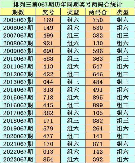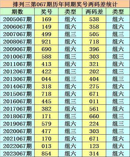 在排列三第067期历史同期开奖中,各号码两码差分别为:358、358、055、178、369、033、123、022、044、257、167、011、156、066、224、033、167、123、134;