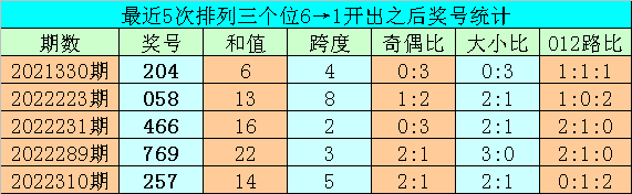 1、排列三前两期个位分别开出号码6和1,历史上个位号码连续两期分别出现6和1时,共有61次。在最近5次出现时,其下期分别出现号码:204、058、466、769、257;