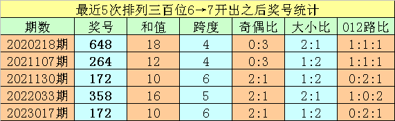 1、排列三最近两期百位号码分别开出6和7,历史上百位号码连续两期分别开出6和7的奖号出现了64期。前五期开出之后其下期奖号分别为:648、264、172、358、172;