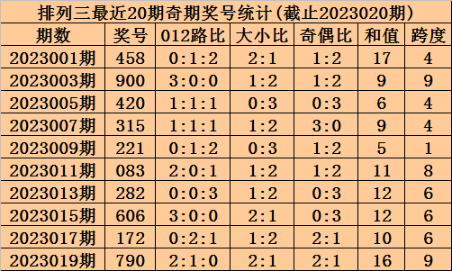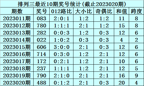 上期回顾:排列三2023020期奖号为488,奇偶比为0:3,大小比为2:1,跨度为20。