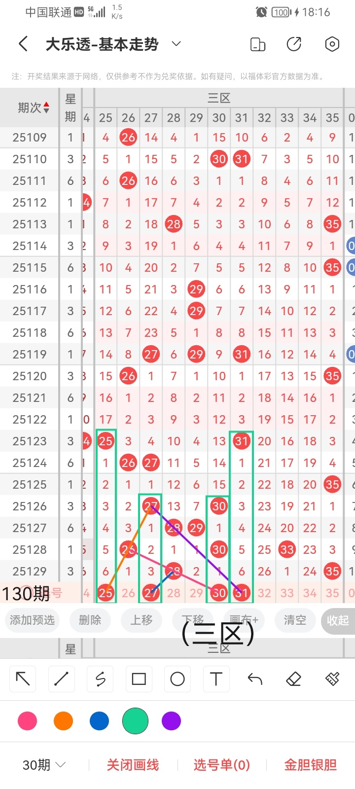 小梁根据图中画线思路,最后给大家汇总提供一下大乐透本期红球、蓝球数据,供大家参考: