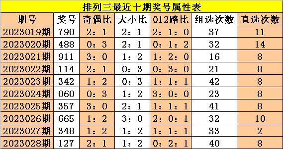 上期回顾:体彩排列三第2023028期奖号:127。,奇偶比2:1,大小比1:2,012比0:2:1。
