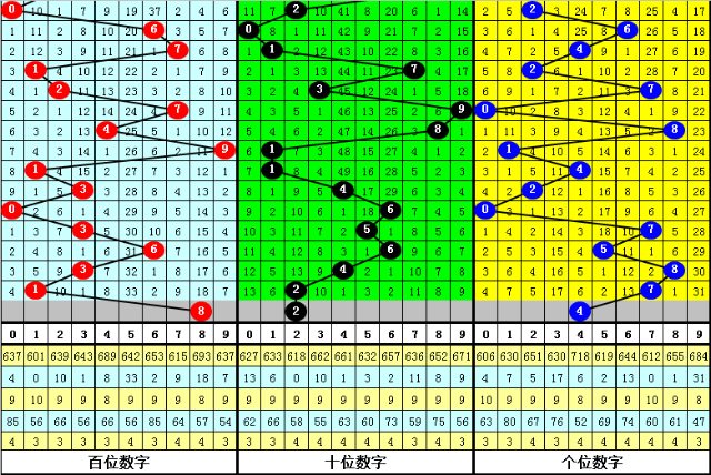 百位走势:近10期在0-9之间出号,跨度为10点,出号比较分散,上期奖号为1,下降2点,本期看好该位上升。另外近10期该位大小比为3:7,大号较冷,本期注意大号回补,关注号码8。