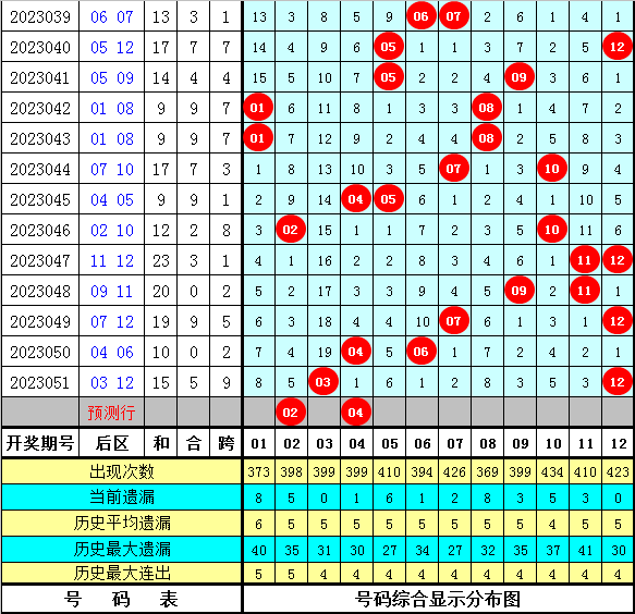 后区分析:后区上期开出奖号03 12,在最近15期开奖中奖,后区各号码频次分别为:号码12开出5次,号码07开出4次,号码05、08、10开出3次,号码01、04、06、09、11开出2次,号码02、03开出1次。本期预计后区在01、02、04、05、09、10之中出现,精选两码02+04。