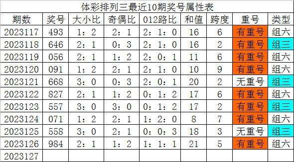 体彩排列三最近10期分别开出奖号:493、646、056、091、668、827、557、071、558、984,各奖号属性详见下表: