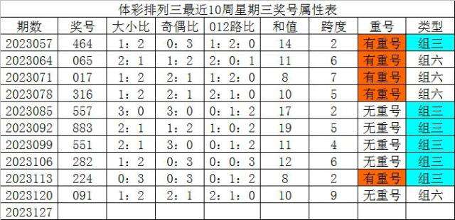 体彩排列三最近10周星期三奖号分别为:464、065、017、316、557、883、551、282、224、091,各奖号属性详见下表:
