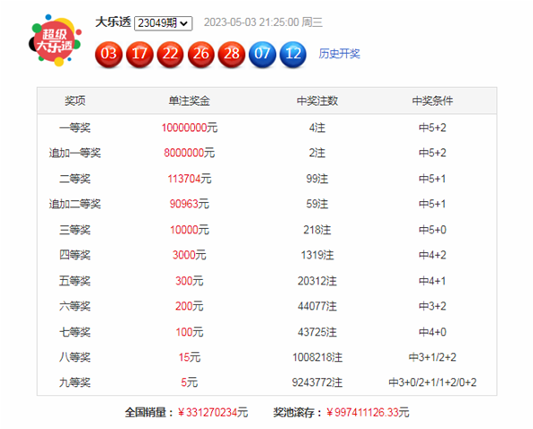 大乐透第2023049期奖号为:03、17、22、26、28+07 12,其中前区奇偶比为2:3,大小比为3:2,和值为96,后区和值为19,跨度为5。