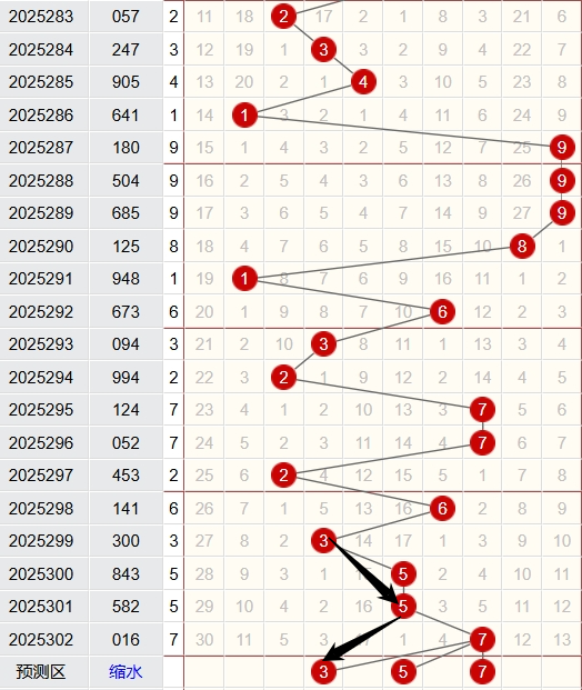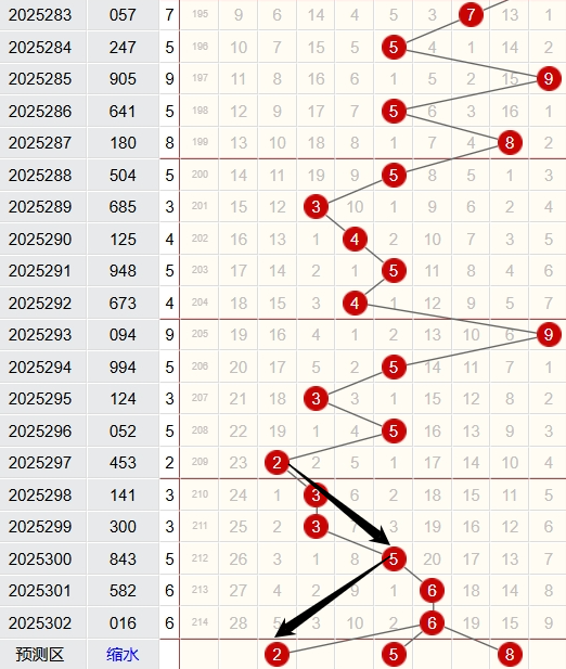 上期跨度为6,近5期跨度开出情况:第25296期开出5,属于奇数,2路号码,土属性;第25299期开出3,属于奇数,0路号码,木属性;第25300期开出5,属于奇数,2路号码,土属性;第25301期开出6,属于偶数,0路号码,水属性;第25302期开出6,属于偶数,0路号码,水属性;