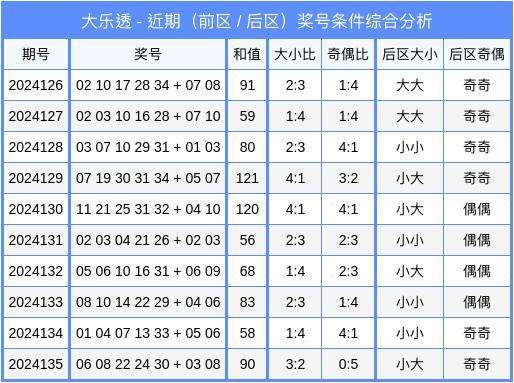 大乐透第2024135期开奖号码:前区06、08、22、24、30;后区03、08。前区号码大小比为3:2,奇偶比为3:2,后区开出奇偶、小大组合。