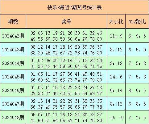 快乐8第2024048期奖号为:05 07 10 11 16 18 24 30 33 37 41 60 61 64 66 69 71 74 76 80,其中奖号012路比为7:7:6,大小比为10:10。