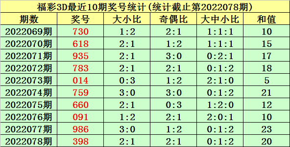 079期唐羽福彩3D预测奖号:和值奇偶大小分析