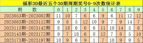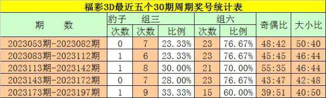 在最近一个30期周期内(第2023173期-第2023202期),组三(含豹子)号码共出现10期,占开奖总数的40%,组六奖号共出现15期,开出比例为60%,组六号码连续出现2期,表现非常活跃,本期预计奖号为组六号码。