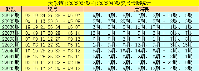 上期回顾:大乐透第2022043期开出奖号:02 16 17 24 30 + 09 12,前区号码奇偶比为1:4,大小比为2:3,和值为89,跨度为28。后区和值为21,跨度为3。