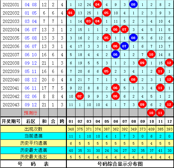 后区上期两码开出09和12,其号码遗漏值为4期+2期,本期后区注意热码和温码组合,参考四码03、04、10、11,两码看好10和11。