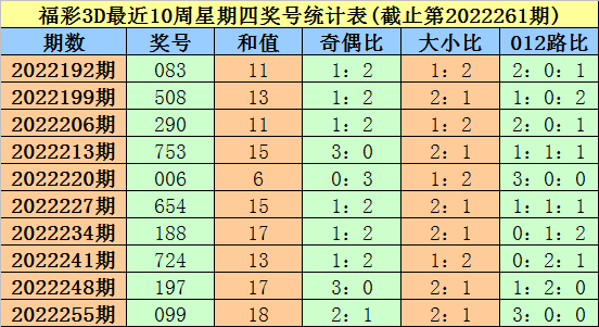 开奖回顾:福彩3D第2022261期奖号为838。其中奖号奇偶比为1:2,大小比为2:1,012路比为1:0:2。