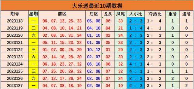 大乐透2023127期开奖:本期奖号,前区04、07、08、18、19,后区02、06。当期前区大小比为2:3,奇偶比为2:3,冷热比为3:2,区间比为3:2:0,012路比为1:3:1。