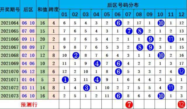 后区大小分析:上期后区开出一个小号球06和一个大号球10,近10期的后区的走势:大号球出现11次,小号球出现9次,大号球走势较热,本期预计大号球继续走热,综合推荐后区:07、08、10、11、12,主推:07、12。