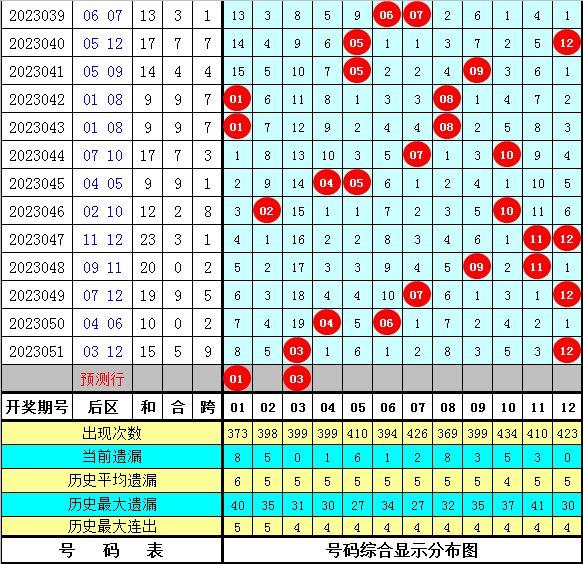 本期后区注意6附近和值出现,后区大范围参考:01、03、07、09、11。