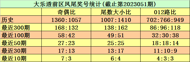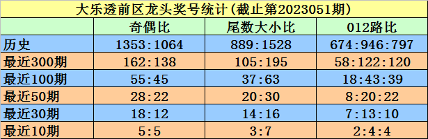 龙头号码奇偶比为5:5,尾数大小比为3:7,012路比为2:4:4。