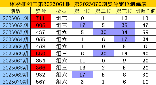 开奖回顾:排列三第2023070期奖号为:567,各位号码遗漏值分别为3、1、6,遗漏总值为10。