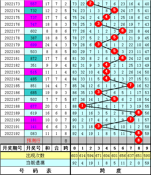 福彩3D第2022192期最大跨度开出8,近期最大跨度波动较大,本期预计最大跨度在5-9区段开出,最大跨度参考6789,一码跨度参考8。
