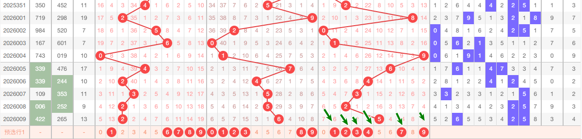 在最近的5期当中百位大数出现的频次0次 小数出现5次 ,从图上来看本期百位出号走大,大家注意防守配号