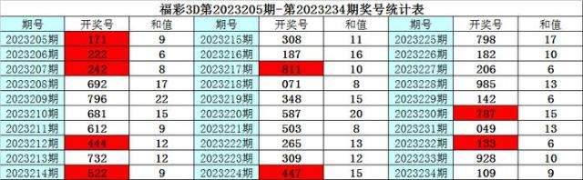 上期回顾:福彩3D第2023234期奖号为:109,其中奖号组选类型为:组六,奇偶比为2:1,大小比为1:2,012路比为2:1:0,和值为10,跨度为9。