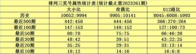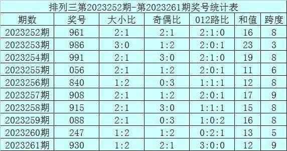上期回顾:排列三第2023261期奖号为930,奖号012路比为3:0:0,奇偶比为2:1,大小比为1:2,和值为12,跨度为9。