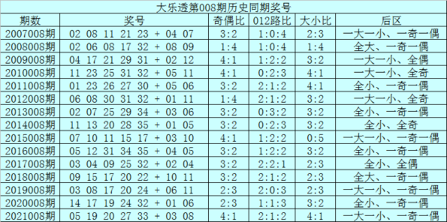 上期开奖号码为小大组合03、11,近50期小小组合出现11期,小大组合出现了26期,大大组合出现了13期,近10期小号出现8次,大号出现12次,综合考虑后区推荐小大组合:04、09