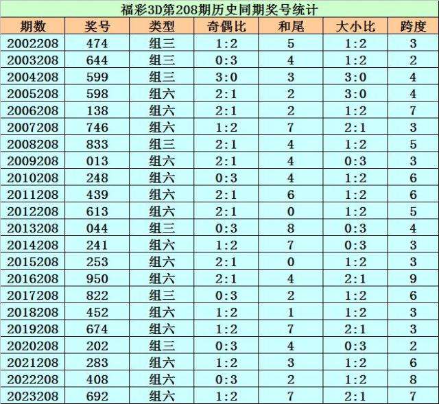 福彩3D历年第208期同期奖号为:474 644 599 598 138 746 833 013 248 439 613 044 241 253 950 822 452 674 202 283 408 692。