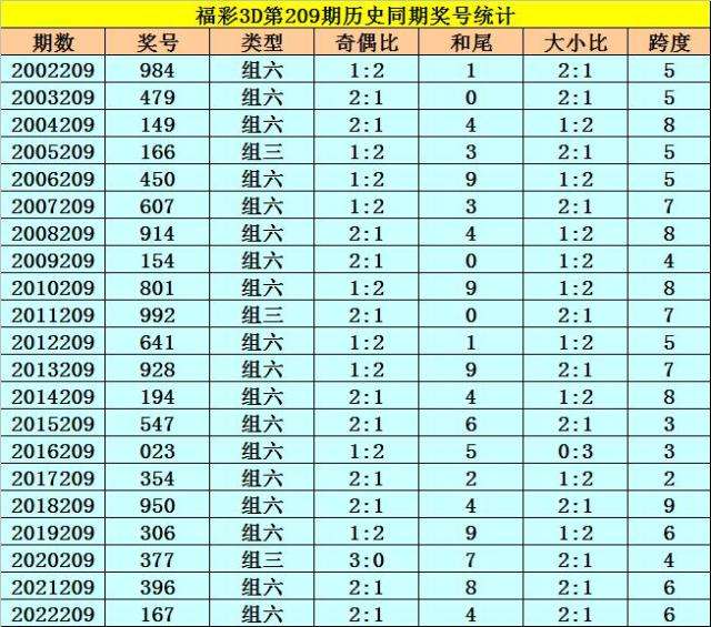 福彩3D历年第209期同期奖号为:984 479 149 166 450 607 914 154 801 992 641 928 194 547 023 354 950 306 377 396 167。