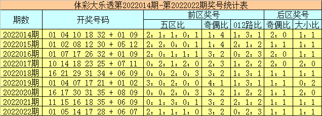 体彩大乐透第2022022期奖号为01 05 14 17 28 + 06 07,前区号码五区比为2:1:1:1:0,奇偶比为3:2,012路比为0:2:3,后区号码奇偶比为1:1,大小比为1:1。