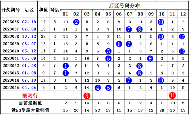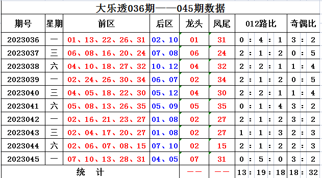 上期回顾,大乐透第2023045开奖,本期奖号:前区07 10 13 28 31;后区04 05,当期前区号码大小比为2:3,三区比2:1:2,奇偶比3:2。前区未开出连号,开出重号07。
