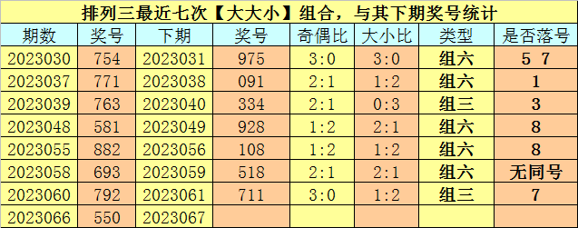 大小分析:排列三上期开出号码550,大小类型为【大大小】,最近七次开出大小类型大大小的奖号分别为:754、771、763、581、882、693、792,其下期分别开出号码:975、091、334、928、108、518、711。其中号码大小比为10:11,大小号码开出比例基本相等,本期预计小号转热,关注大小比1:2。