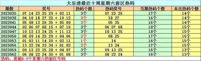 热号分析:最近十周星期六前区热号出现24个,每期平均开出2。4个,热号与理论个数基本相当,上周星期六热号开出3个,热码走势非常明显,本周星期六重点关注热号出现,目前星期六热号有17个,本期预计出现3-4个,关注热号14 23 33。