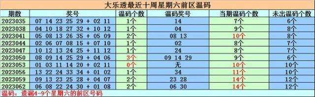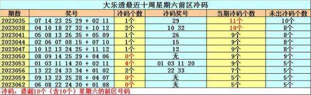 冷号分析:前区冷号在最近十周星期六开出12个,平均每期有1。2个,冷号明显解冻,上周星期六冷号没有出现,冷号没有出现,本周星期六不看好冷号解冻。