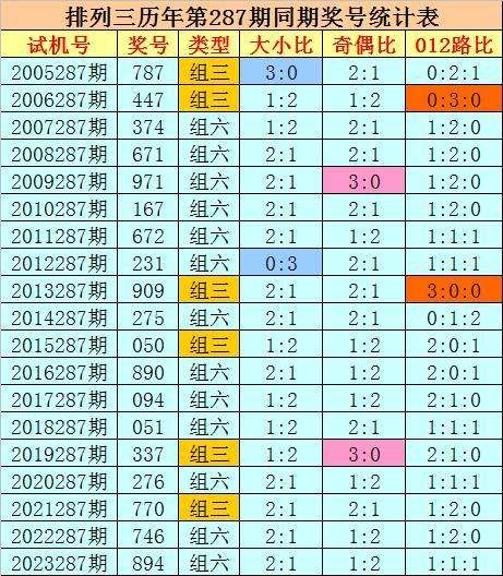 012路分析:历史上排列三第287期同期奖号中,012路奖号总个数比为22:25:10,012路奖号轮空期数比为3:3:10,今年第287期预计1路号码走冷轮空,看好012路比开出2:0:1。