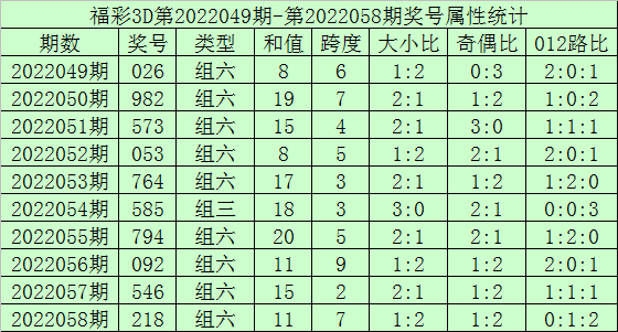 开奖回顾:福彩3D第2022058期开奖号:218,其中奖号和值:11,奇偶比1:2,大小比1:2。