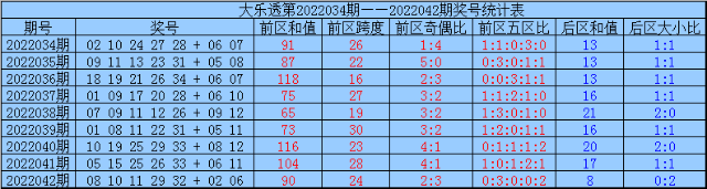 大乐透第2022042期奖号为:08、10、11、29、32 + 02、06。其中前区和值为90,跨度为24,奇偶比为2:3,五区比为0:3:0:0:2。后区和值为8,大小比为0:2。
