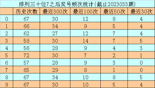 第二位杀号:第二位上期开出奖号为7,该位历史上奖号7开出了638次,最近100次第二位奖号出现7后,下期落号0-9次数从高到低分别为:号码3→14次,0、2→12次,8、9→10次,1、4、6→9次,7→8次,5→7次。