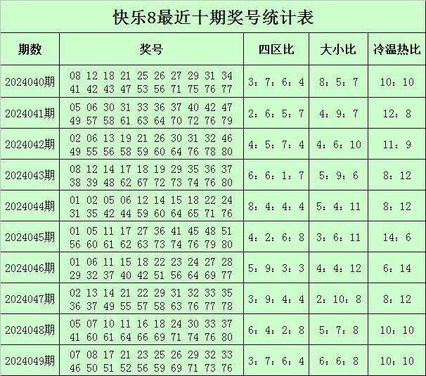 福彩快乐8第2024049期开奖回顾:07 08 17 21 23 25 26 29 32 33 46 50 51 52 56 59 69 71 73 76,其中奖号四区比为3:7:6:4,冷温热码比为6:6:8,大小比为10:10,和值为824,同尾号码为21 51 71、32 52、23 33 73、26 46 56 76、07 17、29 59 69。