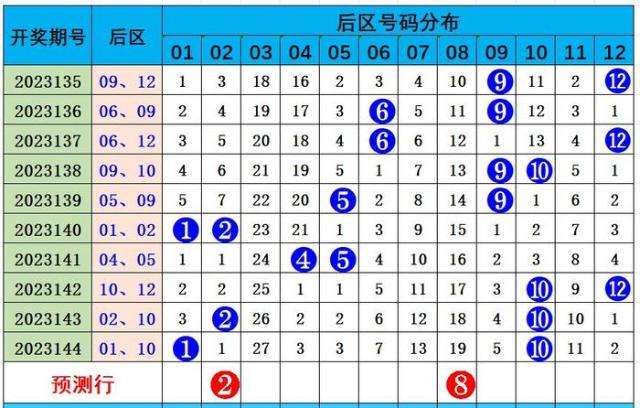 上期后区号码为01号和10号,为小大、奇偶组合,近5期后区小大组合出现2期,偶偶组合出现2期,奇奇组合出现0次。本期大范围看好号码01 02 06 08 12,重点推荐小大、奇偶组合02 08。