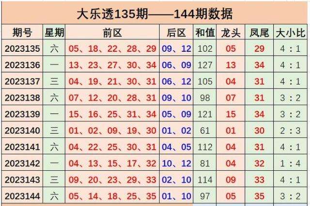 大乐透第2023144期开奖号码:前区05 14 18 25 35,后区01 10;龙头05,凤尾35,和值97,跨度30,前区号码区间比1:2:2,012路比1:1:3,奇偶比为3:2,大小比为3:2,冷热比4:1,0枚重号,0组连号。