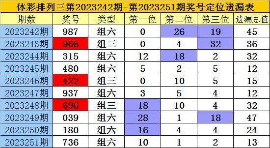 开奖回顾:排列三第2023251期奖号为:736,各位号码遗漏值分别为10、1、2,遗漏总值为13。