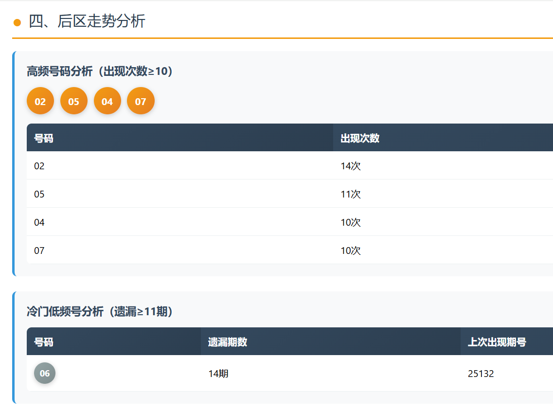 结合高频与间歇性回补的特点,后区可重点围绕以下四个号码进行组合思路参考: