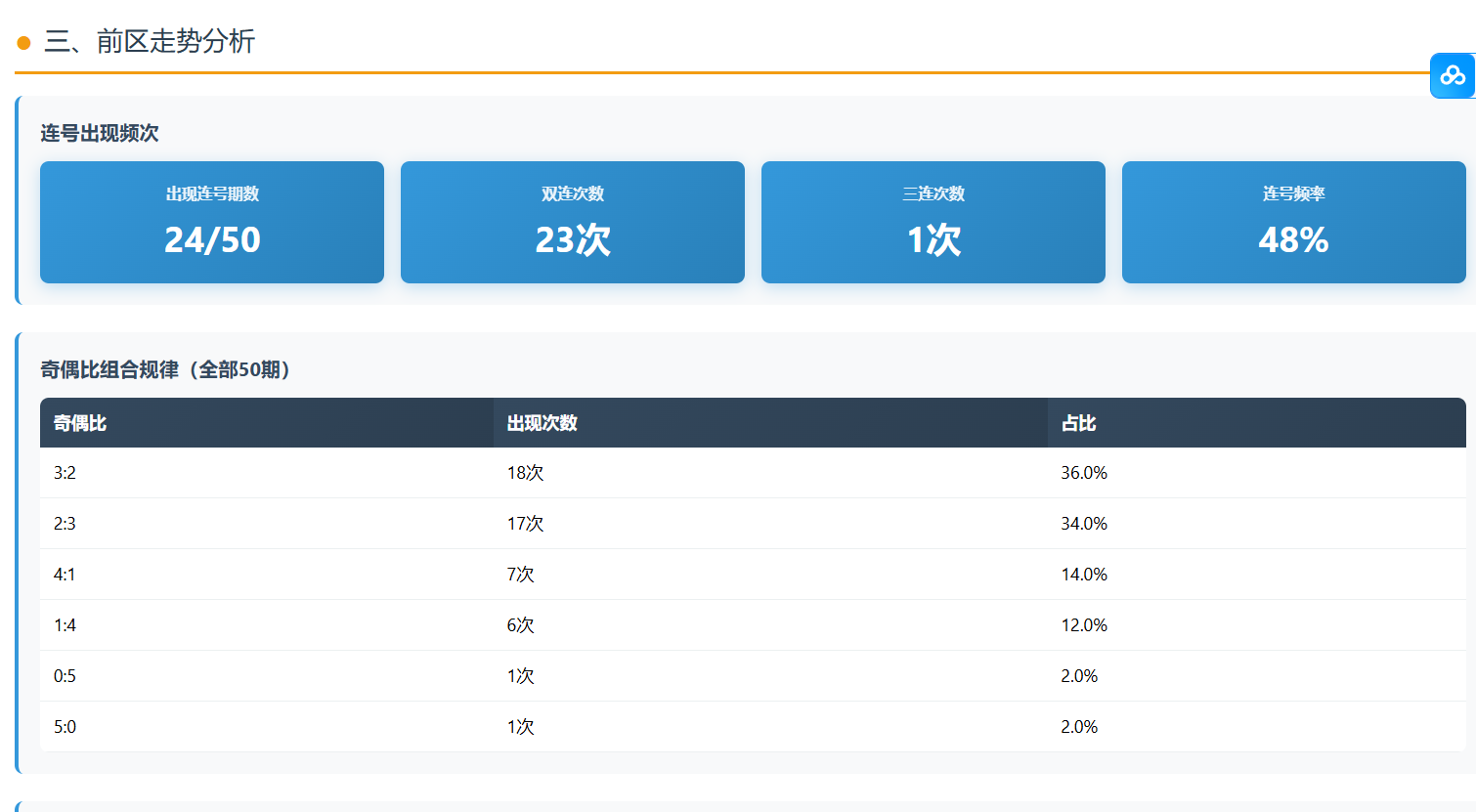 近50期里,有24期出现过连号,频率接近一半,其中双连是绝对主力,三连只出现过一次。换句话说,连号不是每期必来,但一旦出现,通常点到为止,很少贪多。