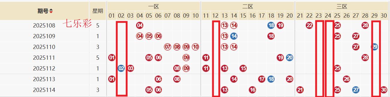 近七期开奖中一区出号数量为1+3+4+4+3+3+2=20枚,整体占比为40.8%;二区出号数量为3+2+2+2+3+3+2=17枚,整体占比为34.7%;三区出号数量为3+2+1+1+1+1+3=12枚,整体占比为24.5%。一区整体占比高于均值,周期内呈现下降趋势,周期内波动较稳,断区可能性不大,本期需小防。二区整体占比略高于均值,呈现下降趋势,鉴于整体波动,本期慎防。三区占比过低,呈上升趋势,本期重点关注。基于动态平衡干预以及波动趋势衡量,本期七乐彩开奖三区比倾向于2:2:3。重点关注周期遗漏的2,12,23,24,29。